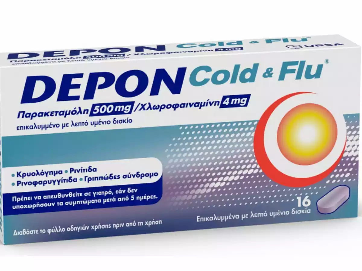 Το DEPON COLD AND FLU είναι ένα φαρμακευτικό σκεύασμα που ανήκει στην κατηγορία των συνδυαστικών φαρμάκων για το κοινό κρυολόγημα. Χρησιμοποιείται για την ανακούφιση συμπτωμάτων όπως ο πυρετός, οι πόνοι, η ρινική καταρροή και το φτέρνισμα. Η θεραπευτική του αποτελεσματικότητα εδράζεται στον συνδυασμό δύο δραστικών ουσιών: της παρακεταμόλης και της μηλεϊνικής χλωροφαιναμίνης. Η παρακεταμόλη (acetaminophen), η οποία κυκλοφορεί παγκοσμίως με πολυάριθμες εμπορικές ονομασίες (όπως Panadol, Tylenol, Depon), είναι μια ευρέως διαδεδομένη αναλγητική και αντιπυρετική ένωση με ασθενή αντιφλεγμονώδη δράση· ο κύριος μηχανισμός της συνίσταται στην αναστολή της βιοσύνθεσης των προσταγλανδινών, χημικών μεσολαβητών του πόνου και του πυρετού, κυρίως στο Κεντρικό Νευρικό Σύστημα (ΚΝΣ). Από την άλλη πλευρά, η μηλεϊνική χλωροφαιναμίνη (chlorphenamine maleate) είναι ένα ισχυρό αντιισταμινικό πρώτης γενιάς, το οποίο δρα ως ανταγωνιστής των υποδοχέων ισταμίνης Η1. Μέσω του ανταγωνιστικού και αναστρέψιμου αποκλεισμού αυτών των υποδοχέων στους ιστούς, η χλωροφαιναμίνη μειώνει ή εξαλείφει τις επιδράσεις της ισταμίνης, όπως η αυξημένη αγγειακή διαπερατότητα και η παραγωγή βλέννας, ανακουφίζοντας έτσι από συμπτώματα όπως η ρινική καταρροή και το φτέρνισμα. Διαθέτει, επιπροσθέτως, και αντιχολινεργική δράση. Η ταξινόμηση του σκευάσματος, σύμφωνα με το σύστημα Ανατομικής/Θεραπευτικής/Χημικής (ATC) ταξινόμησης, εντάσσεται στον κωδικό R05X, δηλαδή στα «Άλλα παρασκευάσματα για το κρυολόγημα», καταδεικνύοντας τον ρόλο του στην συμπτωματική και όχι στην αιτιολογική θεραπεία των ιογενών λοιμώξεων του ανώτερου αναπνευστικού. Η ανάπτυξη μεθόδων HPLC για τον ταυτόχρονο προσδιορισμό των δραστικών ουσιών σε τέτοιου είδους συνδυαστικά σκευάσματα είναι κρίσιμη για τη διασφάλιση της ποιότητας και της ασφάλειάς τους (Kul).